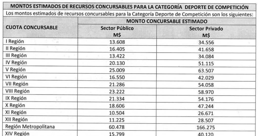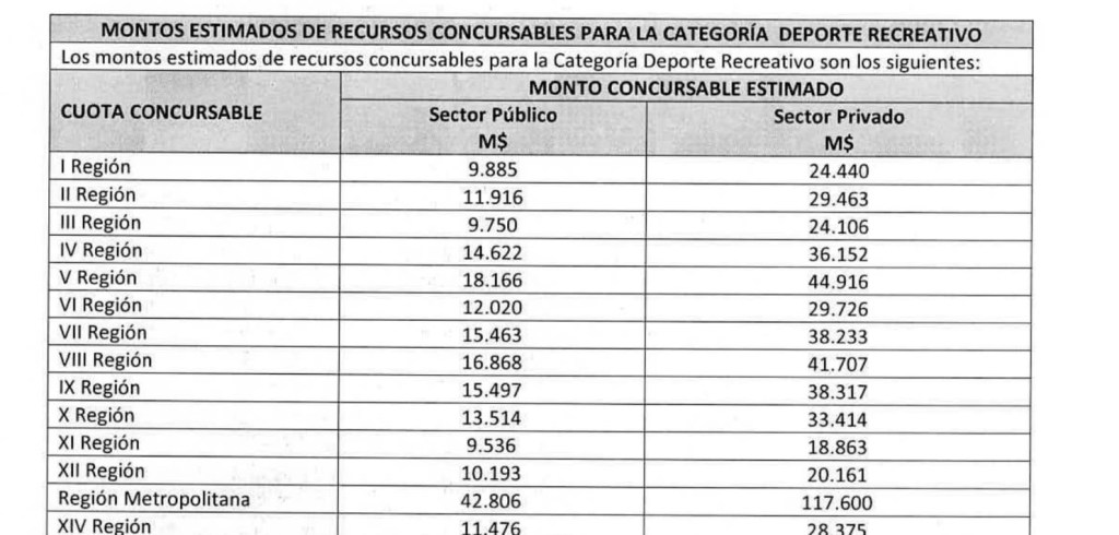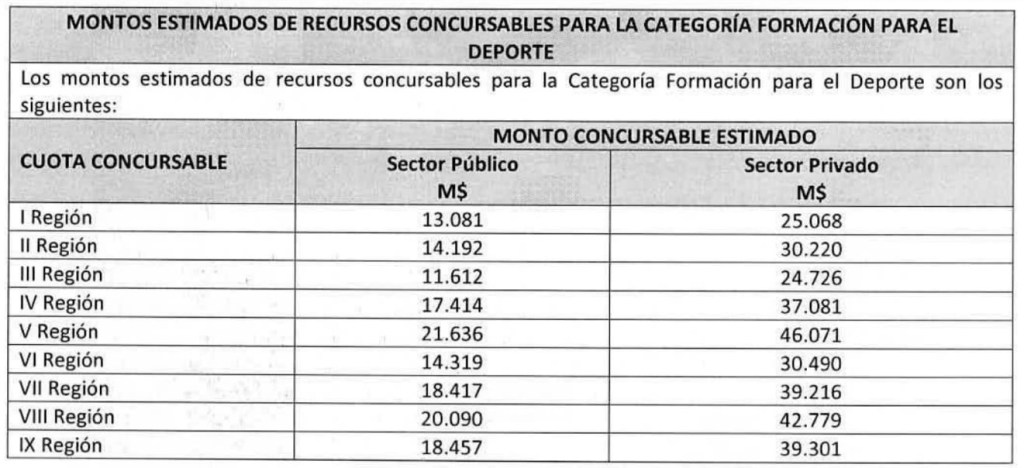 El ministerio del Deporte anualmente hay un concurso público para financiar proyectos deportivos, financiados con aportes privados y públicos. En el caso de la región de O’higgins, los montos a los cuales puedes optar son entre 12 a 40 millones de pesos aproximadamente.